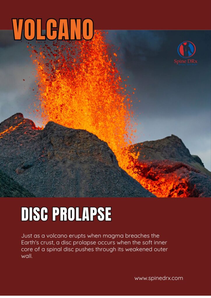 A disc prolapse occurs much like a volcano: when internal pressure becomes too great, the disc’s tough outer wall (the annulus) ruptures like the Earth’s crust. This allows the soft inner gel to leak out like magma, releasing inflammatory chemicals that act like “biological lava” on your nerves. This process causes immediate inflammation and sharp pain, and in some cases, can even lead to nerve damage or muscle weakness.